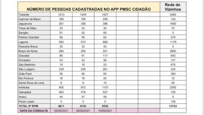 Os números apontam um crescimento em todas as cidades da região. Foto: PMSC Cresce o número de pessoas cadastradas no aplicativo da Polícia Militar de Santa Catarina (PMSC) e na Rede de Vizinhos nas unidades gerenciadas pela 8ª Região de Polícia Militar (RPM), de Tubarão.