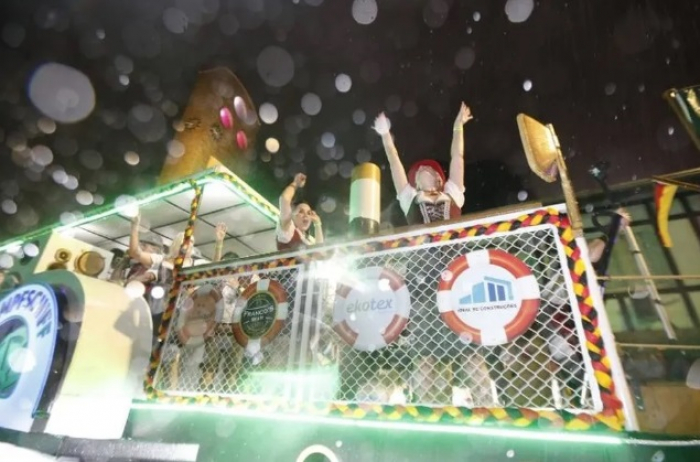 Desfile na Oktoberfest aconteceu sob chuva na quarta-feira (12) — Foto: Patrick Rodrigues/Santa Blumenau, a cidade conhecida por sediar a maior festa alemã das Américas, a Oktoberfest, enfrenta uma segunda suspensão em sua programação de 2023 devido às fortes chuvas que atingem Santa Catarina. A cidade está em alerta devido ao risco de inundação causado pelo aumento do nível do Rio Itajaí-Açu.