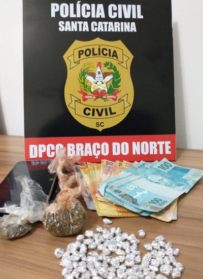 Durante o cumprimento das medidas foi encontrada grande quantidade de crack, aproximadamente 100 pedras já embaladas para venda e duas porções de maconha, além de mais de R$ 800,00 reais. Foto: PC A Polícia Civil de Braço do Norte com apoio das Delegacias de Gravatal e Armazém deflagram a “Operação Caronte”, para o cumprimento de quatro ordens judiciais de busca e apreensão domiciliar, expedidas pelo Juízo da Comarca de Braço do Norte, após parecer favorável do Ministério Público.