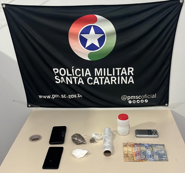 A abordagem aconteceu em um estabelecimento comercial, sendo apreendidos dinheiro em espécie e celulares. Em uma caixa acoplada ao vaso sanitário, 37 gramas de cocaína e uma balança de precisão foram encontradas. Ainda em um móvel do banheiro, 24 gramas de maconha e embalagens para as drogas foram localizadas.