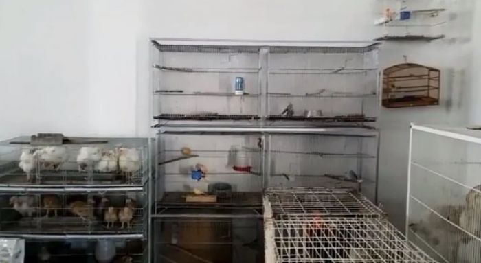 Vídeos feitos pelos policiais mostram aves presas em gaiolas pequenas, amontoadas umas em cima das outras em um cômodo. Também foi encontrada uma jiboia em um recipiente de vidro.