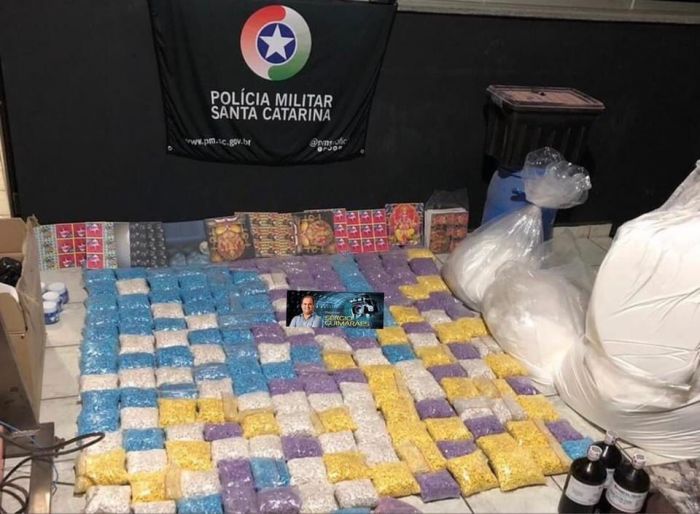 Foram apreendidos 234 mil comprimidos de ecstasy, 66.520 micro pontos de LSD e aproximadamente 48 quilos de MDMA, além de 4 munições calibre 38. Foto: PM Policiais militares visualizaram diversas averiguações acerca de movimentação suspeita de veículos na região do Laranjal, cidade de Imaruí, bem como, da realização de festas no mesmo local. Ontem, com ordem judicial, foi deflagrada operação para dar cumprimento a determinação judicial.
