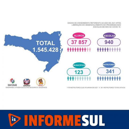 Proerd - Em 2021 o Programa Educacional de Resistência às Drogas e à Violência (Proerd) computou após a liberação do programa nas escolas, devido ao Covid-19, a formação de 37.857 alunos, em 940 escolas em 123 municípios, com o trabalho de 341 instrutores. O Proerd, desde a sua criação em Santa Catarina em 1998, formou 1.545.428 alunos.