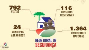 Rede Rural de Segurança - A Rede Rural vem se constituindo como estratégia de policiamento que está trazendo maior efetividade na segurança nas áreas rurais de Santa Catarina, em uma parceria que fortalece os laços entre polícia e comunidade rural, em uma união de esforços para resolução de problemas de ordem pública. Em 2021 o programa atendeu a 24 municípios, realizou 792 visitas, 116 consultas preventivas e mapeou 1.364 propriedades.