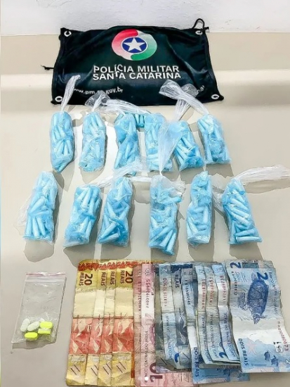 No total, foram apreendidos 312 pinos de cocaína, 5 comprimidos de ecstasy e 131 reais em dinheiro.
