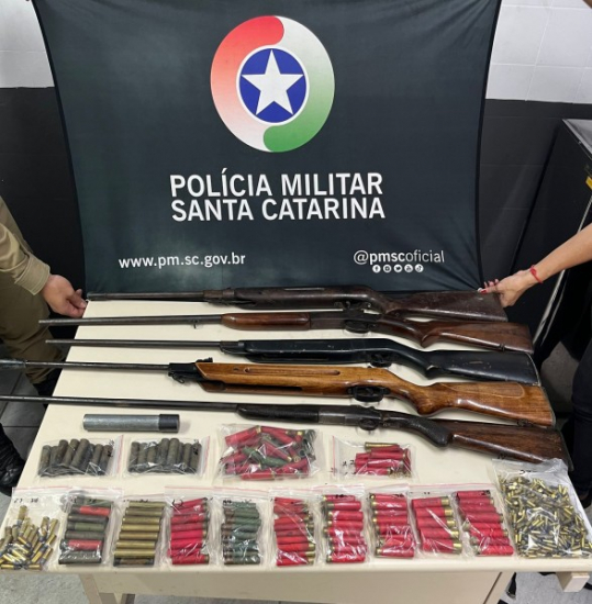 A Polícia Militar (PM) apreendeu uma grande quantidade de armas e munições na manhã deste sábado, dia 27, na área rural de Nova Veneza. De acordo com a PM, os materiais apreendidos foram encontrados durante uma tentativa de cumprimento de mandado de prisão.