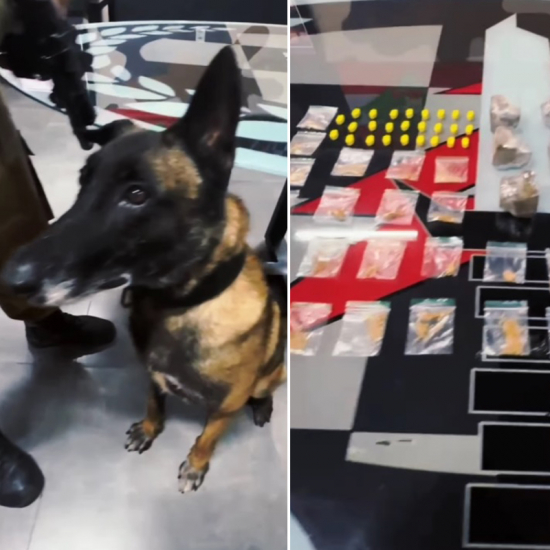 Durante as buscas no local indicado, o cão farejador (K-9) identificou o odor característico de entorpecentes. Foram encontradas 50 porções de maconha, embaladas individualmente e divididas em cinco pacotes com 10 porções cada, além de sete porções maiores, totalizando 310,3 gramas da droga. Também foram apreendidas 45 sacolas de anfetaminas (MD) e 26 comprimidos de ecstasy.