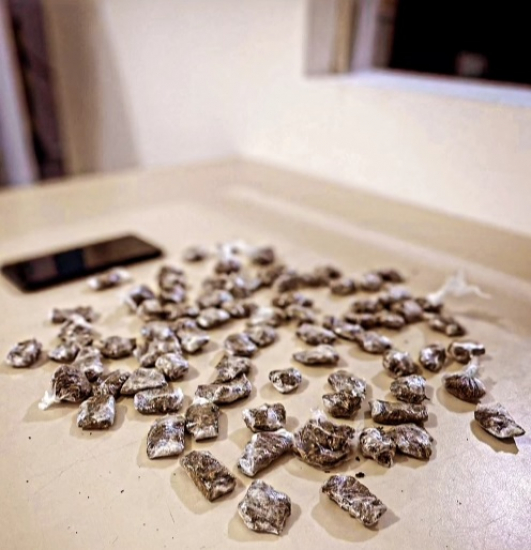 Os militares tinham informações de que este homem teria drogas em sua casa e, com o auxílio do cão policial, foram encontradas várias porções de maconha, prontas para venda, somando um total de 195 gramas.