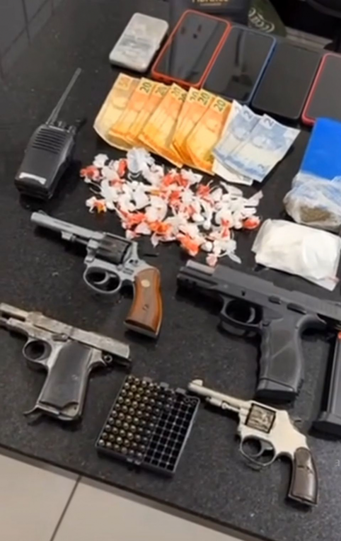 Durante a ação, foram apreendidos quatro armas de fogo, munições, rádios comunicadores, celulares, porções de cocaína e maconha, além de R$ 196 em espécie. Segundo informações da polícia, um dos homens, que já tinha mandado de prisão por homicídio no estado do Pará, usava uma identidade falsa para tentar desprezar as autoridades.