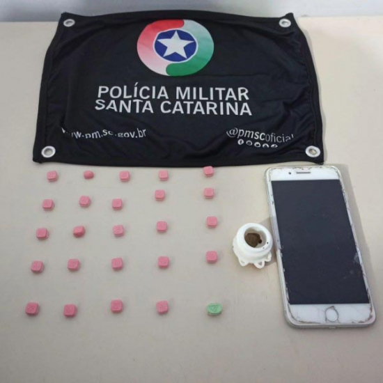 Após a volta da guarnição de uma ocorrência no mesmo local, o homem foi localizado e submetido à busca pessoal. Foram apreendidos com o suspeito 25 comprimidos de ecstasy e 1,3 gramas de haxixe. O homem foi encaminhado para a Delegacia de Polícia Civil.