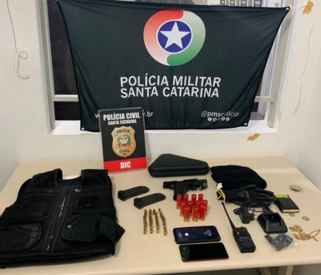 29 munições de calibre .380, de 11 munições de calibre 12, uma pistola .380 com mira laser, colete balístico, balaclava e um rádio comunicador. Foto: PC As Polícias Civil e Militar da Divisão de Investigação Criminal de Tubarão, da agência de inteligência e do PPT de Tubarão, deram cumprimento a um mandado de busca e apreensão no início da manhã de hoje e apreenderam 29 munições de calibre .380, de 11 munições de calibre 12, uma pistola .380 com mira laser, colete balístico, balaclava e um rádio comunicador.