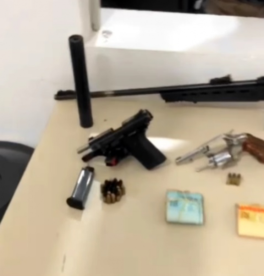 Os policiais abordaram os suspeitos no bar e, durante a revista, encontraram quatro armas de fogo, incluindo revólveres e uma pistola, além de munições e um supressor de ruídos (silenciador). Os dois homens foram detidos e conduzidos à Delegacia de Polícia Civil.