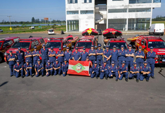 Nesta terça-feira, às 9h, o Corpo de Bombeiros Militar de Santa Catarina (CBMSC) mobiliza mais recursos para auxiliar nos resgates no Rio Grande do Sul, incluindo equipes especializadas com cães de busca.