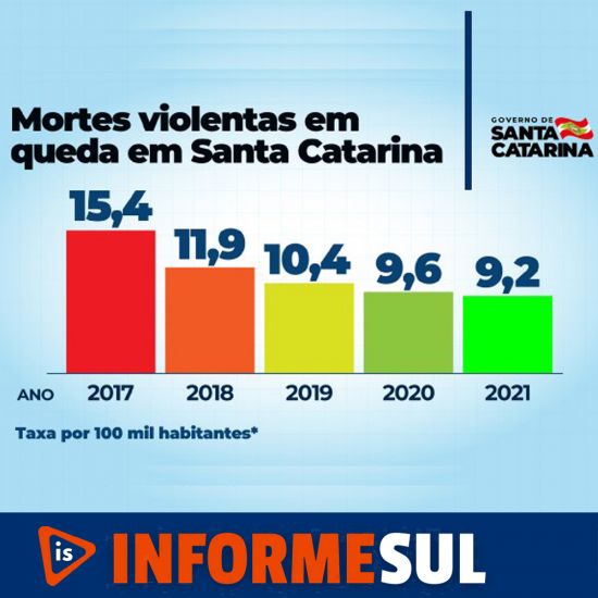 média brasileira de mortes por 100 mil habitantes é de 19,3. Isso significa que a taxa catarinense (9,2) é menos da metade da nacional. Foto: Divulgação Santa Catarina teve mais um ano de redução nas mortes violentas em 2021. A taxa por 100 mil habitantes caiu de 9,6 para 9,2, conforme dados disponibilizados pelo Colegiado Superior de Segurança Pública e Perícia Oficial (CSSPPO). Com isso, o estado se consolida como o mais seguro do Sul do Brasil. Para efeito de comparação, o índice de mortes violentas nos estados vizinhos ficou em 14,5 no Rio Grande do Sul e 16,8 no Paraná. Em nível nacional, apenas São Paulo possui taxa menor (6,6).
