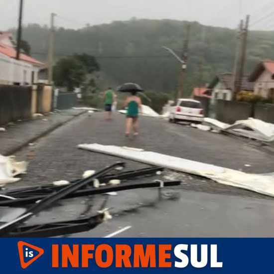 A cobertura metálica da Escola Municipal Toneza Cascaes foi arrancada pela força das rajdas do vento. Parte da estrutura voou e atingiu o Ginásio Homero de Miranda Gomes, que fica na Rua Pe. Paulo Brátti, no bairro Santista.