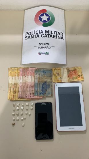Com o suspeito foi localizado em revista pessoal 21 pedras de crack que pesando juntas renderam 4,6 gramas do entorpecente. Também foi localizado R$ 134,00 em espécie. Foto: PM Policiais militares sabendo que estava ocorrendo um intenso comércio de entorpecentes ao lado de um estabelecimento comercial no bairro São Clemente em Tubarão, deslocaram até as proximidades para conferirem a situação do delito.