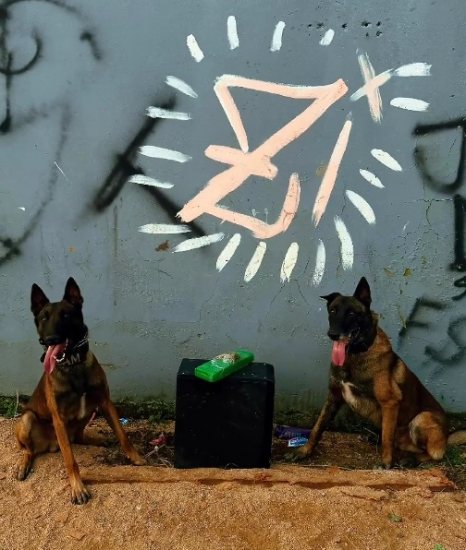 Apesar da fuga dos suspeitos, a guarnição acionou o cão policial K9-MAXX para realizar buscas nas imediações onde os suspeitos foram avistados inicialmente. O K9-MAXX indicou um ponto específico em um terreno baldio no final da Rua Fernando Esmeraldino de Menezes. No local, os policiais encontraram uma sacola contendo substância semelhante à maconha, com peso bruto aproximado de 980 gramas.