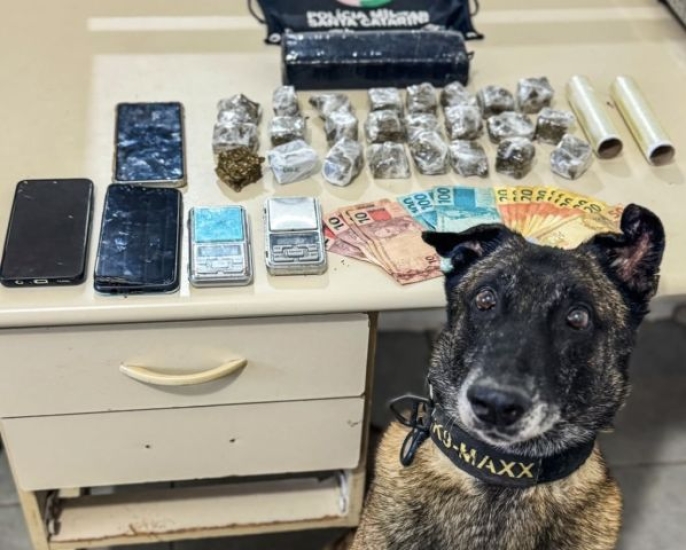 No total, foram apreendidos 1,2 kg de maconha, materiais para embalagem da droga, duas balanças de precisão e R$ 570 em dinheiro.