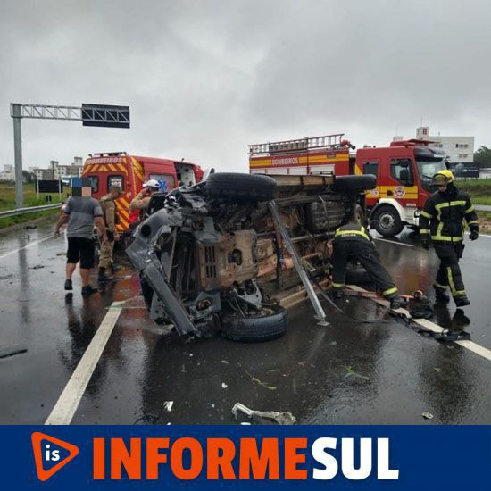 Após aquaplanagem, um veículo Toyota Hilux, com placa de Sombrio capotou no início da tarde deste domingo, dia 13, na Via Rápida, na localidade de Cristo Redentor. Sete pessoas estavam dentro do veículo, sendo cinco adultos e duas crianças.