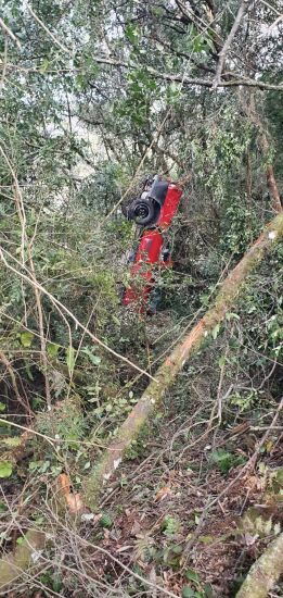 O veículo foi encontrado na posição vertical com o capô virado para baixo e escorado em algumas árvores. Foto: Bombeiros Um jovem de 24 anos sofreu um acidente de trânsito e foi socorrido 16 horas depois em Lages, na Serra Catarinense. Segundo os bombeiros militares que atenderam a ocorrência, o veículo do homem saiu de pista e capotou.