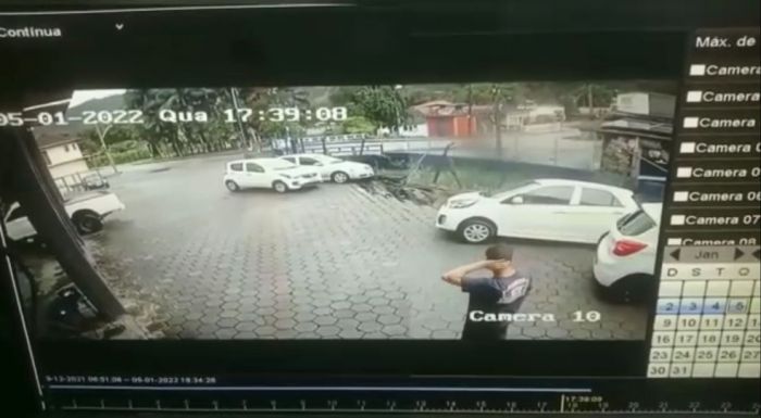 Um motorista saiu ileso ao tirar o carro de uma vaga de estacionamento segundos antes de um desmoronamento sobre um ribeirão em Blumenau, no Vale do Itajaí. Outro veículo caiu no buraco formado após o desabamento (assista acima).